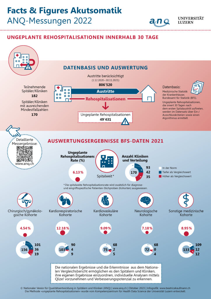 Im Rahmen der nationalen Qualitätsmessungen des ANQ wurden 806’520 Hospitalisationen in 170 Spital und Klinikstandorten auf ungeplante Wiedereintritte untersucht. Diese sind definiert als unvorhergesehene akute klinische Ereignisse, die innert 30 Tagen nach einem Spitalaufenthalt auftreten und einen Wiedereintritt in ein Spital nötig machen. Die Analyse basiert auf Daten aus der Medizinischen Statistik der Krankenhäuser des Bundesamts für Statistik (BFS) und deckt den Zeitraum vom 1. Dezember 2020 bis 30. November 2021 ab.