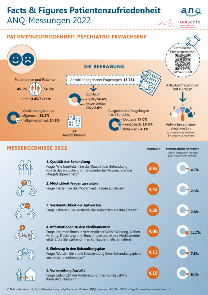 Im Rahmen der fünften nationalen Zufriedenheitsmessung des ANQ bewerteten erwachsene Patientinnen und Patienten, die zwischen dem 1. April und dem 30. Juni 2022 aus der stationären Psychiatrie austraten, verschiedene Aspekte ihres Aufenthalts. Insgesamt 7’791 Fragebogen aus 94 Kliniken flossen in die Auswertung ein. Die Rücklaufquote betrug 56,6% und war damit höher als in den vorangehenden Befragungen.