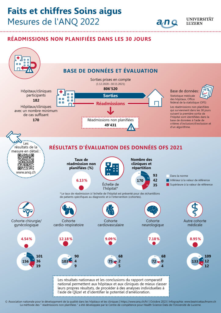 Dans le cadre des mesures nationales de la qualité de l’ANQ, 806’520 hospitalisations sur 170 sites hospitaliers et cliniques ont été analysées pour examiner de plus près le phénomène des réadmissions non planifiées. Ces dernières sont définies comme des événements cliniques aigus imprévus survenant dans les 30 jours suivant une hospitalisation et nécessitant une réadmission à l’hôpital. L’analyse repose sur les données de la statistique médicale des hôpitaux de l’Office fédéral de la statistique (OFS) et couvre la période du 1er décembre 2020 au 30 novembre 2021.