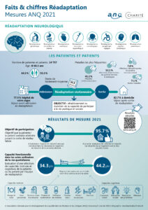 En 2021, les patientes et patients admis en réadaptation stationnaire ont réalisé en moyenne des progrès considérables pendant leur traitement. C’est ce que montrent les résultats des mesures de la qualité réalisées au sein des cliniques et unités de réadaptation suisses sur mandat de l’Association nationale pour le développement de la qualité dans les hôpitaux et les cliniques (ANQ). L’évaluation englobe 104 institutions ayant transmis les données de 92’241 patientes et patients stationnaires admis en réadaptation gériatrique, en médecine interne, cardiaque, musculo-squelettique, neurologique, oncologique, paraplégiologique, psychosomatique et pulmonaire. Dans tous les domaines de réadaptation et par-delà l’ensemble des mesures, les cliniques ont obtenu, en comparaison nationale, des résultats qui, à quelques rares exceptions près, évoluaient dans la fourchette statistiquement attendue, voire la dépassaient.