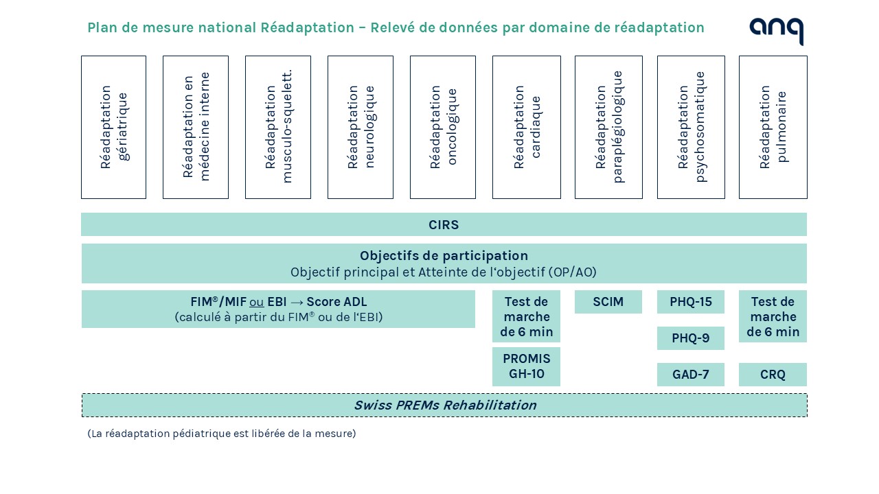 Les cliniques et unités de réadaptation suisses effectuent les mesures prescrites par l'ANQ à l'admission et à la sortie des patientes et patients. Les résultats des mesures mettent ainsi en exergue les progrès réalisés pendant le traitement. Selon le domaine de réadaptation, les mesures couvrent différents aspects de la qualité des résultats.