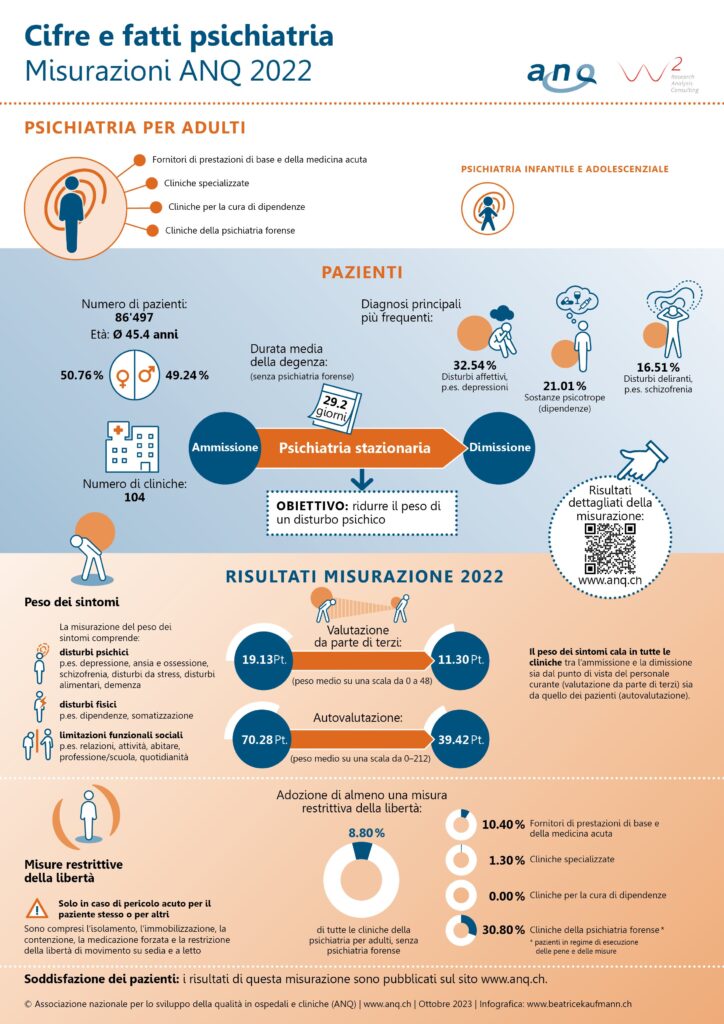 L’Associazione nazionale per lo sviluppo della qualità in ospedali e cliniche (ANQ) ha pubblicato oggi i risultati della misurazione della qualità 2022 nella psichiatria per adulti, infantile e adolescenziale, i quali attestano che le cure stazionarie sono all’origine di un sensibile calo del peso medio dei sintomi dei pazienti. Il tasso di casi con almeno una misura restrittiva della libertà è inoltre diminuito rispetto all’anno precedente.