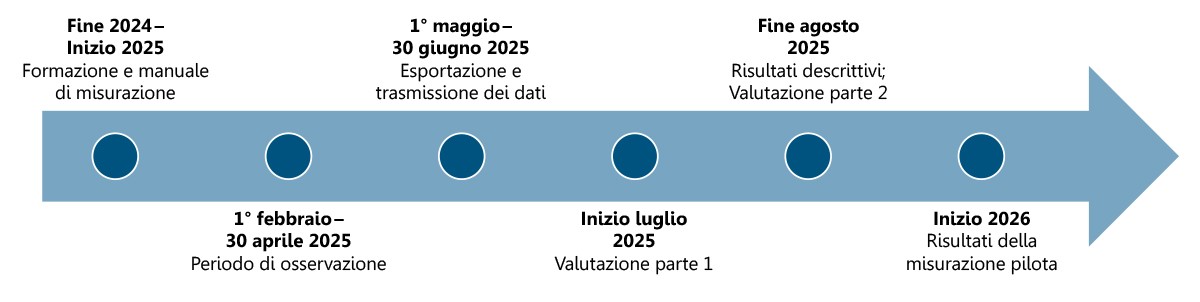 La misurazione pilota inizierà nel febbraio 2025 e il periodo di osservazione duerà 3 mesi fino alle fine di aprile 2025. I risultati saranno disponibili per gli ospedali e le cliniche partecipanti alla fine di agosto 2025.